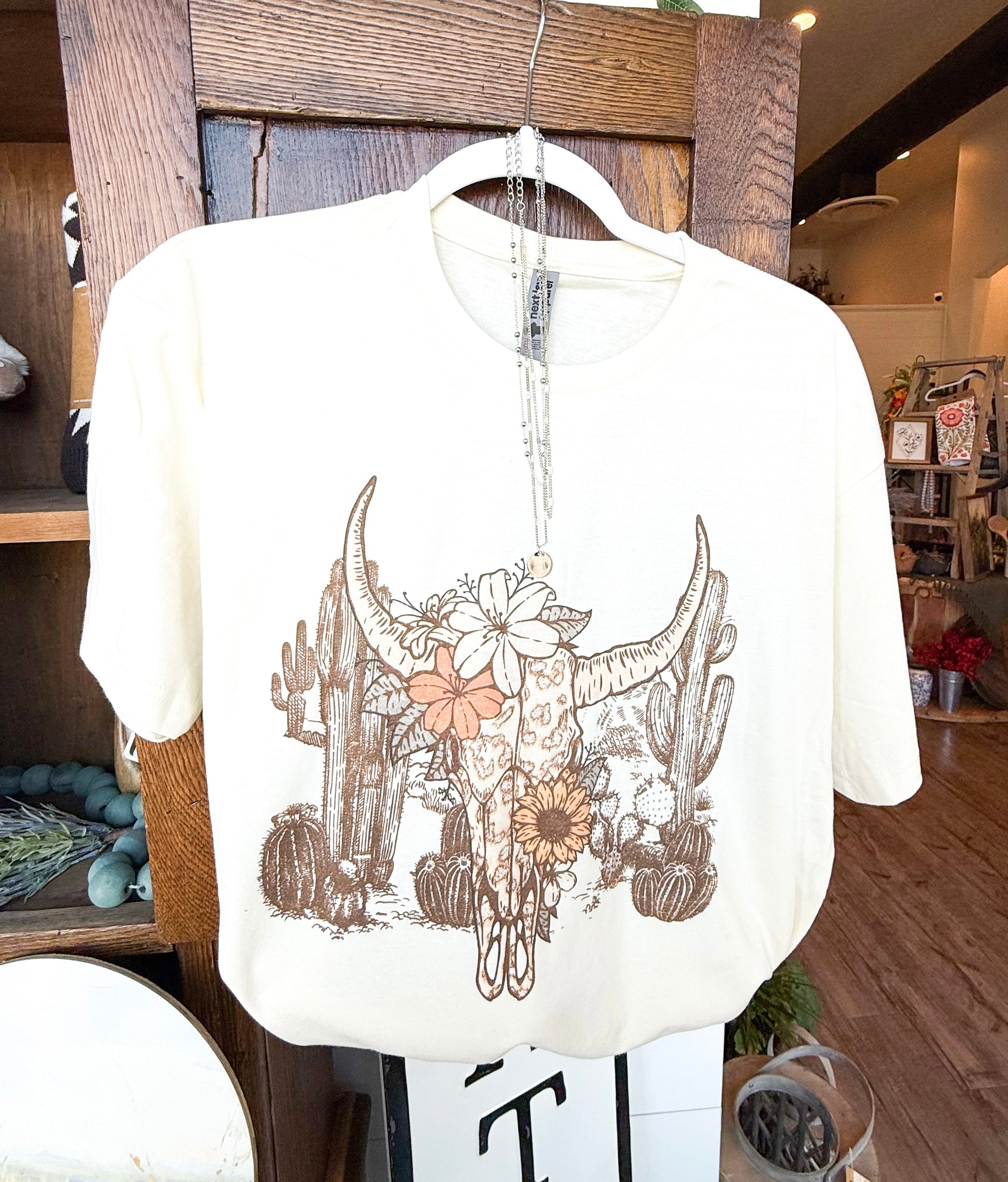 Bring a touch of charm to your wardrobe with this floral desert skull tee. Professionally printed on 100% soft ring-spun cotton, it’s garment dyed for that perfectly lived-in feel and designed to hold its shape wash after wash. With a relaxed unisex fit, this tee is as comfortable as it is stylish—perfect for everyday wear or layered up for a cozy boutique look.